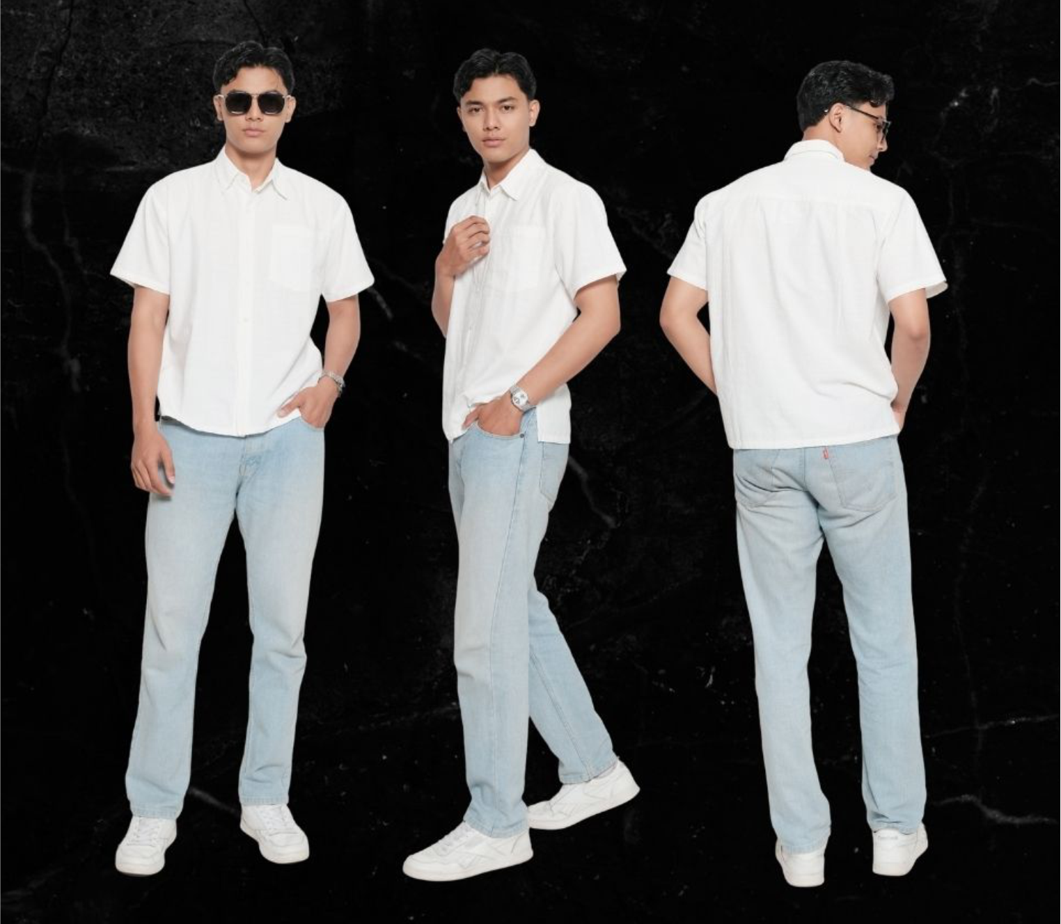 Untuk menciptakan look yang lebih dinamis, padukan kemeja putih dengan denim terang. Warna denim yang lebih cerah memberikan kesan santai namun tetap stylish. Kombinasi ini cocok digunakan untuk aktivitas sehari-hari, mulai dari bekerja di ruang kreatif, meeting santai, hingga hangout bersama teman. Perpaduan antara atasan putih yang bersih dan denim terang menciptakan kontras yang segar sekaligus modern.