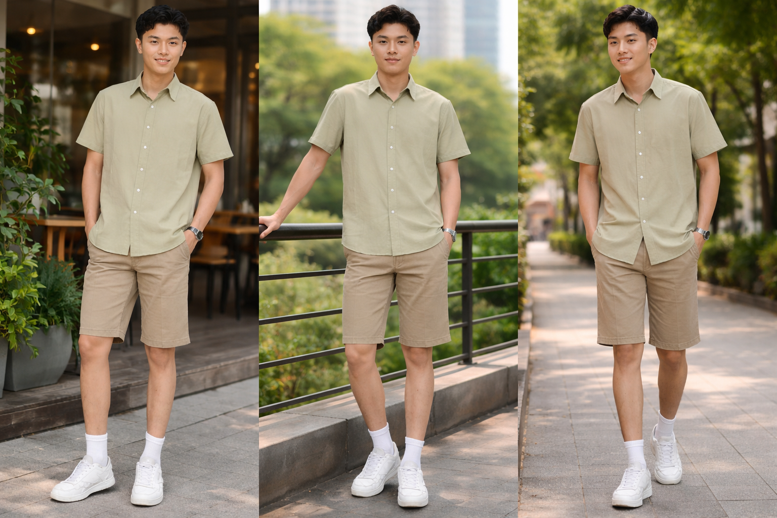 Jika ingin terlihat sedikit lebih rapi namun tetap santai, kemeja berbahan ringan seperti linen bisa menjadi pilihan. Padukan dengan celana pendek atau celana panjang kasual untuk menciptakan tampilan yang seimbang.
